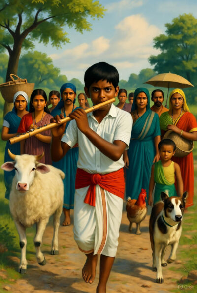 ஊர் மக்கள் மயங்கி நின்றார்கள். ஆனந்தன் அப்படியே புல்லாங்குழலை வாசித்தபடியே முன்னால் சென்றான். அவனுக்குப் பின்னாலேயே அந்த ஊரிலிருந்த ஆண்கள், பெண்கள் குழந்தைகள், ஆடுகள், மாடுகள், கோழிகள், நாய்கள் எல்லாரும் மாயத்தால் கட்டுப்பட்டவர்களைப் போல நடந்தனர்.
