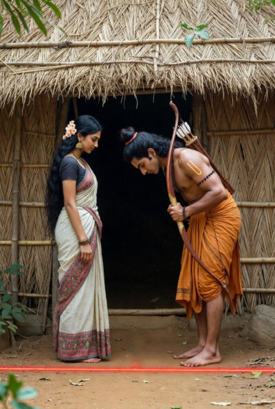 “அன்னையே, நான் கிளம்புவதற்கு முன்பு சொல்ல ஒன்று உண்டு. இந்தக் குடிலைச் சுற்றி, இராமநாமத்தைச் சொல்லி மூன்று கோடுகள் வரைந்திருக்கிறேன். எந்தச் சூழலிலும் நானோ அண்ணனோ வரும் வரை அந்தக் கோட்டைத் தாண்டி வெளியேற வேண்டாம். இதற்கு மட்டுமாவது உறுதியளியுங்கள்” என்றான் இலக்குவன்.கோடுகளையும் வரைந்து முடித்தான்.