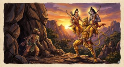 அப்போது மலையின் சரிவுகளில் ஒரு பிரம்மாண்டமானத் தங்க மேகம் நகர்ந்து வருவதைப் போல அனுமன் வந்துகொண்டிருந்தான். அருகில் வர வர சுக்ரீவனின் கண்கள் ஆச்சரியத்தில் விரிந்தன. தன் ஆத்ம நண்பனும், கிஷ்கிந்தையின் மதியூக மந்திரியுமான அனுமன், தான் சோதிக்கச் சென்ற அந்த இரு வீரர்களையும் தன் இரு தோள்களிலும் சுமந்து வந்துகொண்டிருந்தான்.