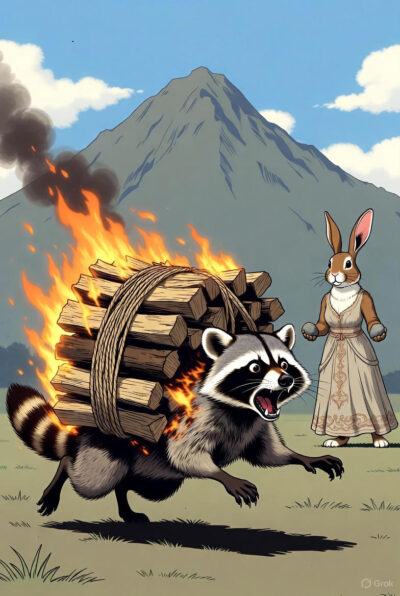 “ராக்கூனே, இந்த விறகுக்கட்டைகளை என்னால் சுமக்க முடியவில்லை. நீ எனக்காக இதைச் சுமந்து வருவாயா” எனக் கேட்டது.