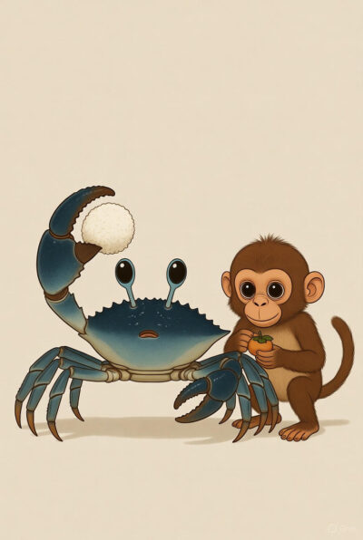 முன்னொரு காலத்தில், ஜப்பானில் ஒரு விளைநிலத்தில் குரங்கும் நண்டும் வசித்து வந்தன. ஒருநாள் நண்டு தன் கொடுக்கில் சோற்று உருண்டையைச் சுமந்து சென்றது. குரங்கு தன் கையில் சீமைப்பனிச்சை என்னும் பழத்தின் விதையை வைத்திருந்தது.