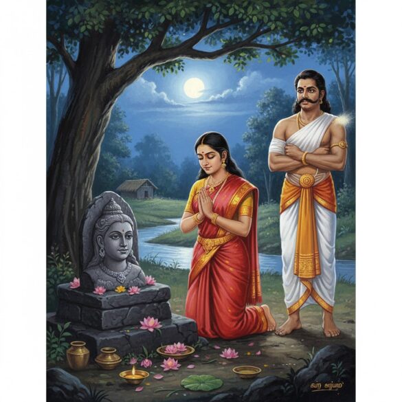 மேலிருந்து சந்திரனிடமிருந்து வந்த ஒளியெலாம் சேர்த்துச் சிற்பிகள் படைத்த கலைச்சிற்பமாய் மின்னினாள் அவள். வானின் நிலவுப் பக்கம் சென்று கொண்டிருந்த கருமேகம் ஒன்று தொபுக்கெனக் கீழே குதித்து அவள் கூந்தலில் அமர்ந்தது போலக் கார்கூந்தல். முகத்தில் மாலையில்தான் மஞ்சள் பூசிக் குளித்திருப்பாள் போலும். நிலவொளியில் தங்கமெனத் தகதகக்க, அழகாய்ப் பழுத்த மஞ்சள் மாங்கனியின் கதுப்புகளை வைத்தாற்போன்ற கன்னங்கள் இருபுறமும் இருக்க, நாசி சங்குபுஷ்பத்தை நினைவுபடுத்த, கண்களிலோ நாவற்பழச் சலனங்கள். அழகாய் இவள் புருவத்தைப் பார்த்துத்தான் வில் செய்திருப்பார்கள் போலும்! சிவப்பு நிறச் சீலையும் அதற்குப் பொருத்தமாய்க் கச்சும் அணிந்திருந்தாள். அவள் கண்களிலிருந்து விழுந்த நீர் கன்னங்களில் விழுந்ததால் பூரித்து மண்ணில் வீழ்ந்தன.