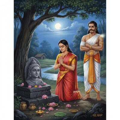 மெல்ல பின்புறம் திரும்பி நின்றிருந்த அவளருகில் சென்று குதிரையிலிருந்து இறங்கி, “பெண்ணே! இப்படி அவதி அவதியென ஓடி வரக் காரணம் என்ன? இந்தச் சோக கீதம் ஏன்?” என்று கேட்டவன் அவள் திரும்பியதும் திகைத்தான்.