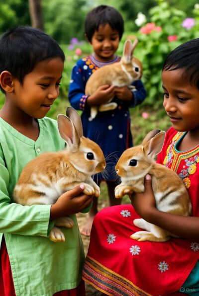 நான்கு முயல்களும் அந்த சிறுவனும் சிறுமியும் இருக்கும் வீட்டுக்கு வந்தன. உரிமையோடு உள்ளே நுழைந்தன.