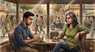 மாலை நான்கு பதினைந்து. பிரிகேட் சாலை. போக்குவரத்துச் சத்தம் காதைப் பிளந்தது. தேநீரகத்தின் ஓரத்து மேஜை. அர்ஜுன் இரண்டாவது காபியைக் குடித்துக் கொண்டிருந்தான். கண்கள் கண்ணாடி கதவையே வெறித்தன.