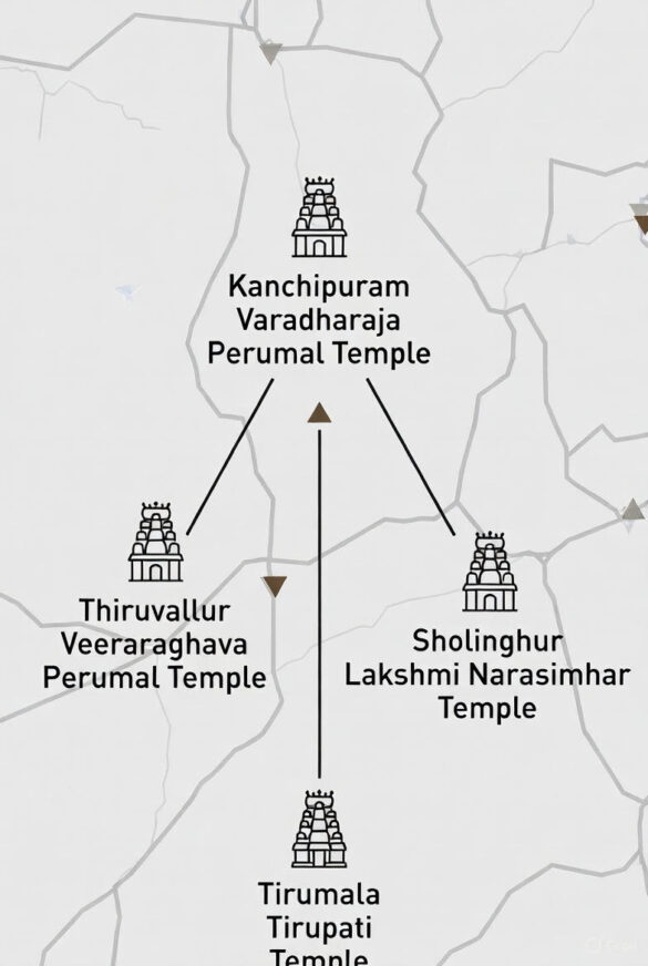 இப்படியான இடத்தில், ஸ்தல சயனப் பெருமாள் கோயிலிலிருந்து பக்கத்தில் இருக்கும் பெரிய சந்தை என்றால் அது காஞ்சிபுரம்தான். காஞ்சிபுரத்தில் வரதராஜப் பெருமாள் கோயில் இருக்கிறது. அங்கிருந்து நேராகப் போனால் திருவள்ளூர் வீரராகவ பெருமாள் கோயில். வரதராஜப் பெருமாள் கோயிலிலிருந்தும், வீரராகவப் பெருமாள் கோயிலிலிருந்தும் சோளிங்கர் லட்சுமி நரசிம்மர் கோயிலுக்கு நேர்வழியில் போக முடியும். அப்படி, மூன்று கோயில்களையும் இணைக்கிற மாதிரி ஒரு கோடு வரைந்தால் அது ஒரு முக்கோண வடிவத்தைத் தரும். அங்கிருந்து நேராகப் போனால் திருமலை திருப்பதி கோயிலுக்குப் போக முடியும்.